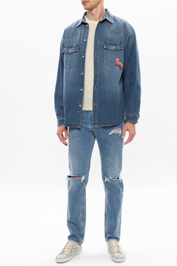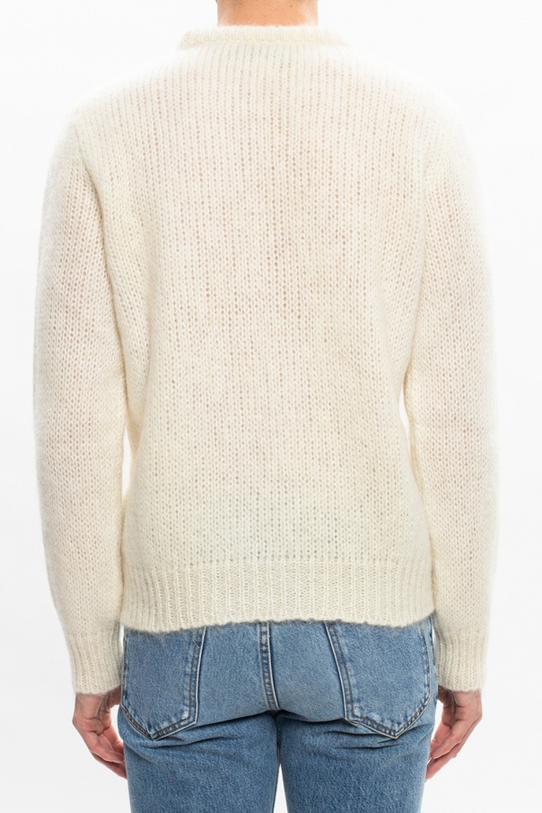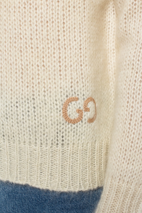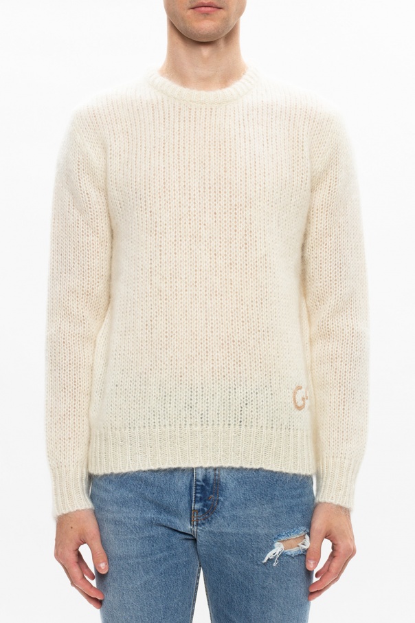 Cream knitted sweater with a round neck from Gucci. This long sleeve design is decorated with a beige logo embroidery.