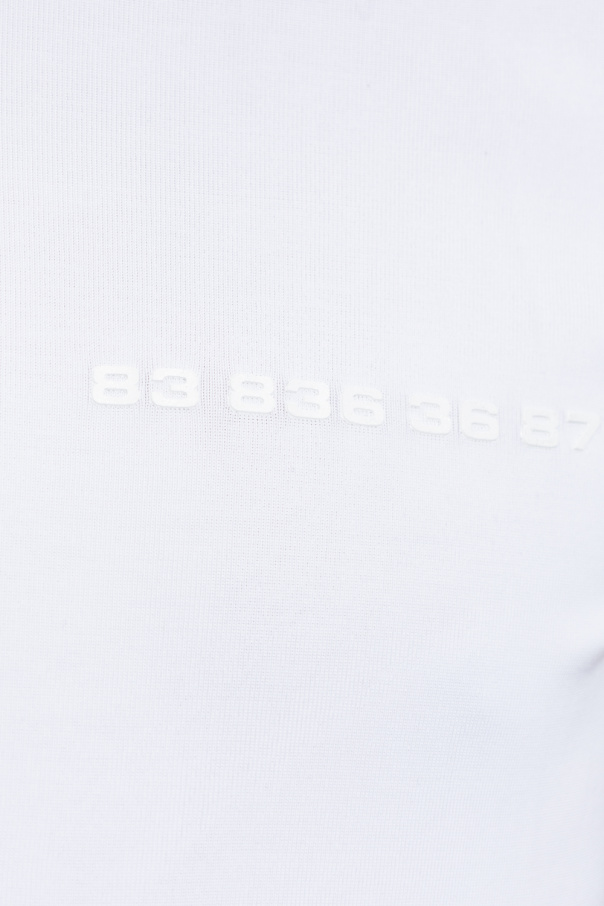 White sleeveless turtleneck sweater from VTMNTS. Embellished with a rubberised print on the front, this style features a snug collar and detachable padding on the shoulders.