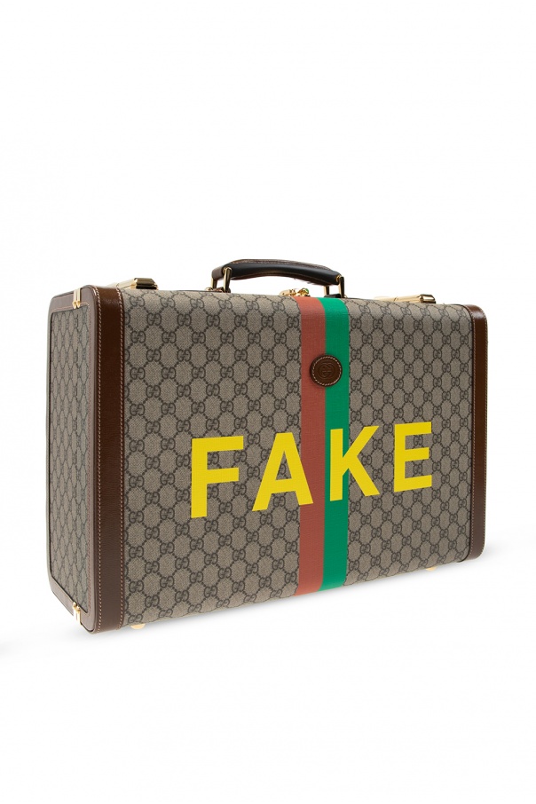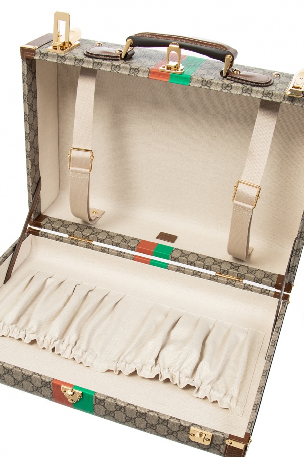 Beige and brown suitcase from Gucci. Crafted from GG Supreme canvas with leather trims, this model features snap buttons, a print, logo appliqué, half-round handle, gold-tone metal hardware and one internal compartment with two slip pockets.
