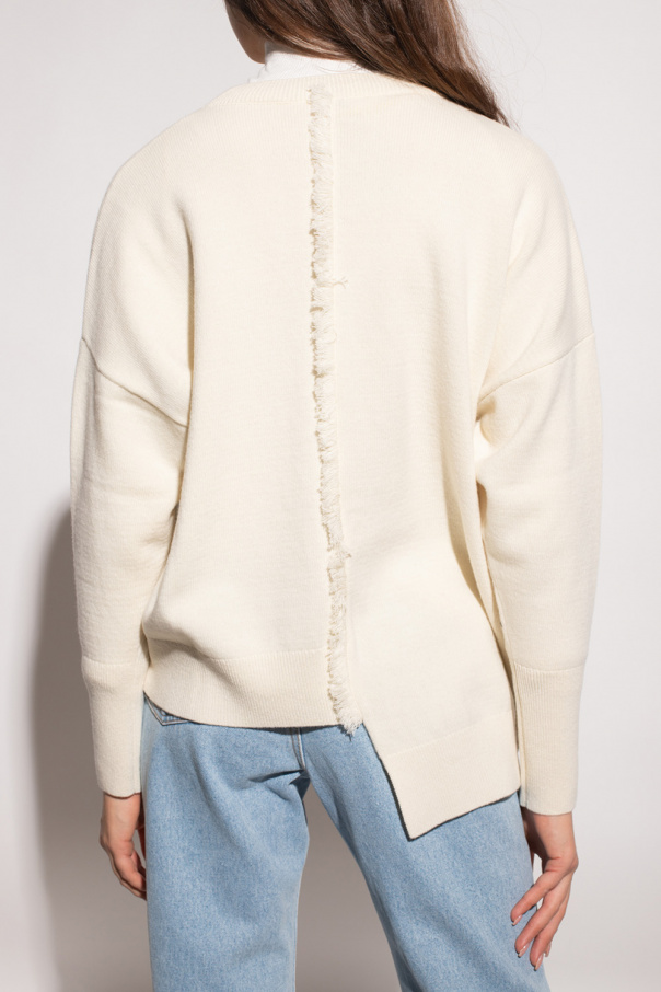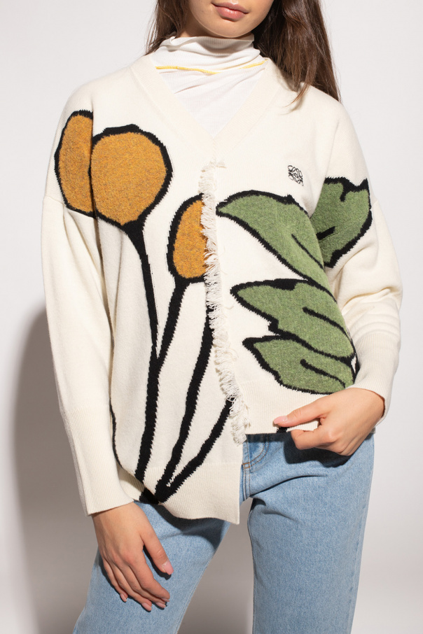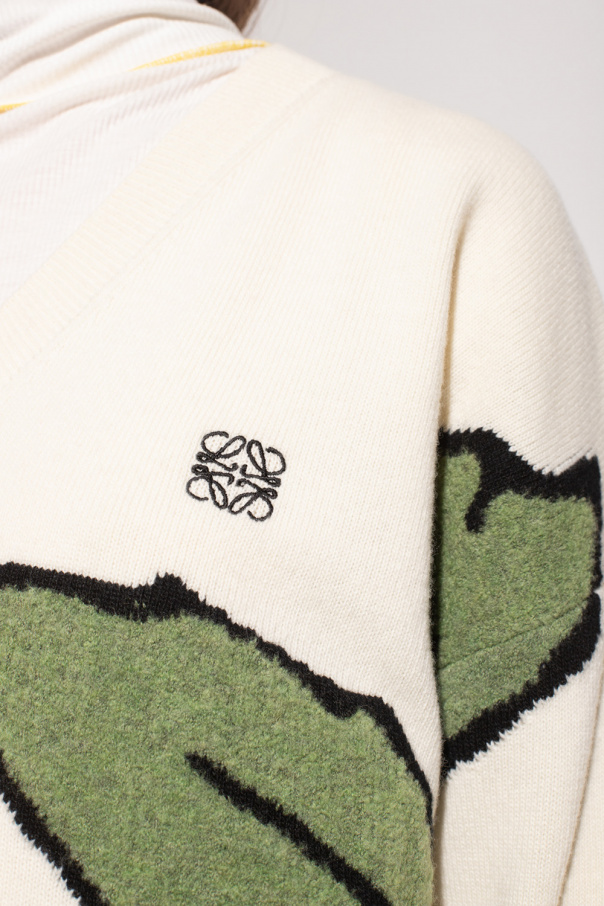 Cream sweater from Loewe. Made of wool, this garment features green, black and yellow inserts, logo detail, asymmetric trims as well as a ribbed V-neck, hem and cuffs.
