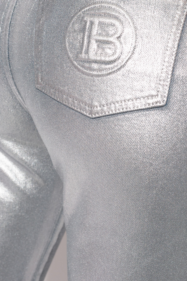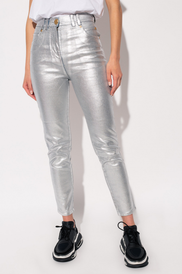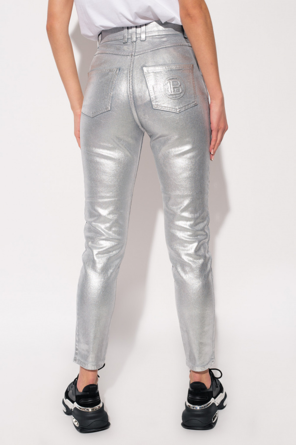 Silver-tone jeans from Balmain. Falling with slightly tapered legs, this pair features a zip fly with a button, four pockets on the front and two pockets on the back – one is accentuated with a raised logo.