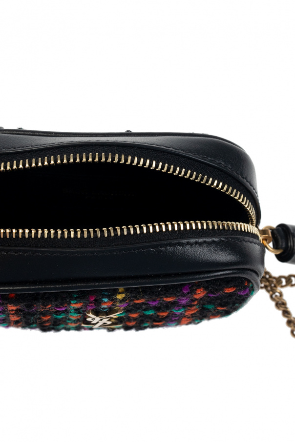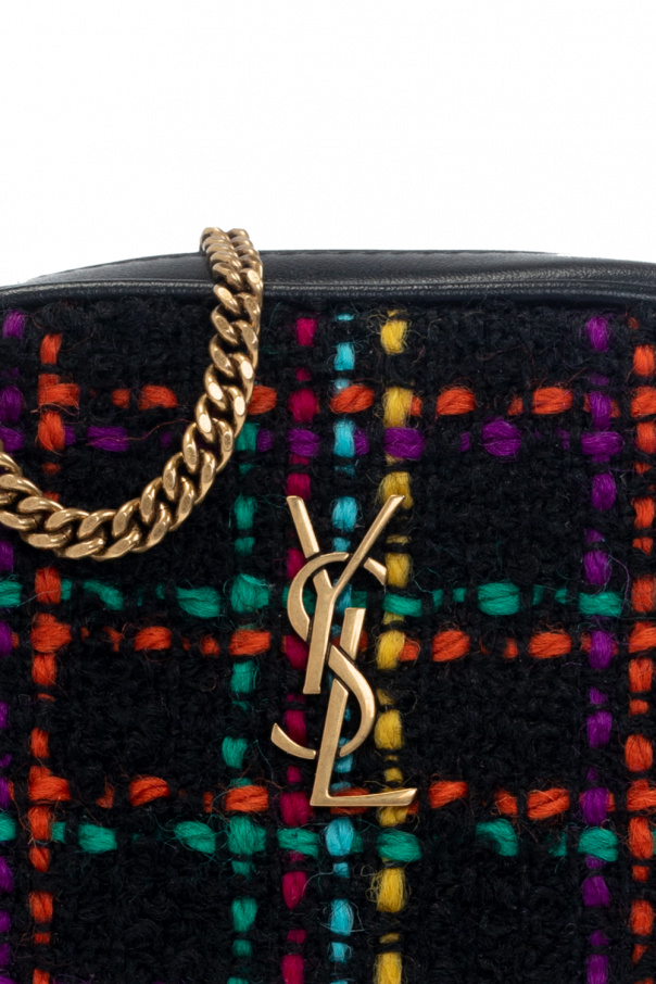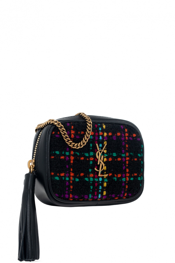 Black ‘Baby Lou’ belt bag from Saint Laurent. Crafted from wool tweed with a colourful check pattern, this design features metal YSL initials on the front, leather trims, an adjustable strap reinforced with a chain, gold-tone metal hardware and one internal compartment.