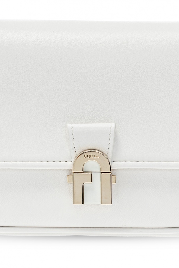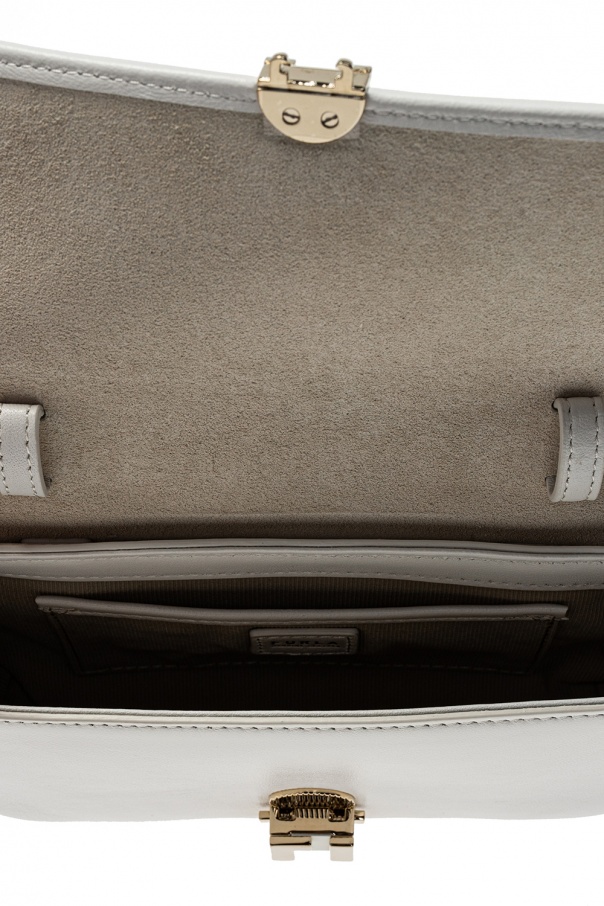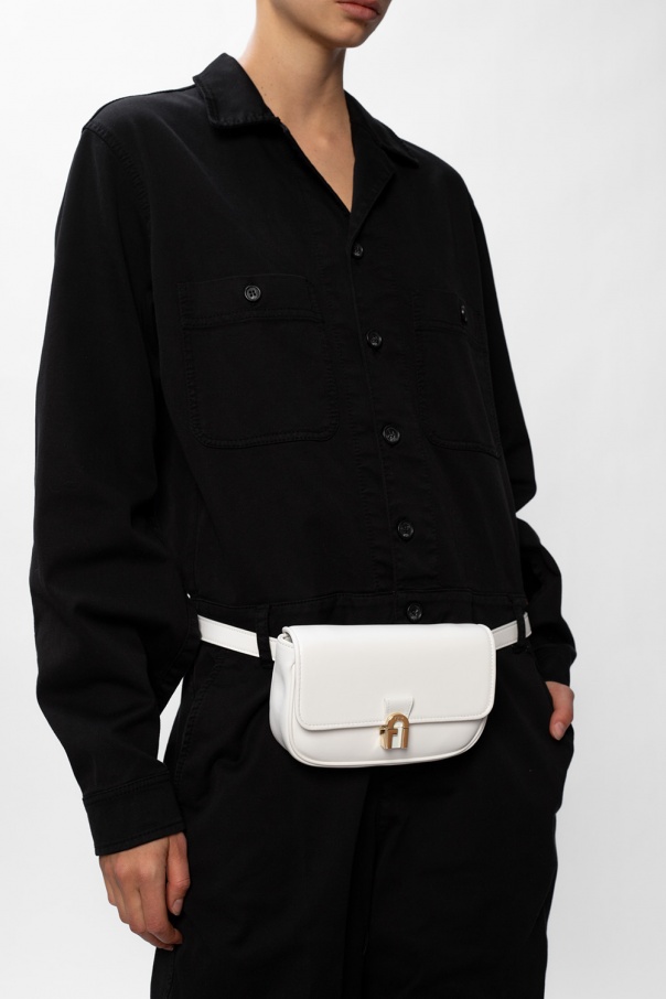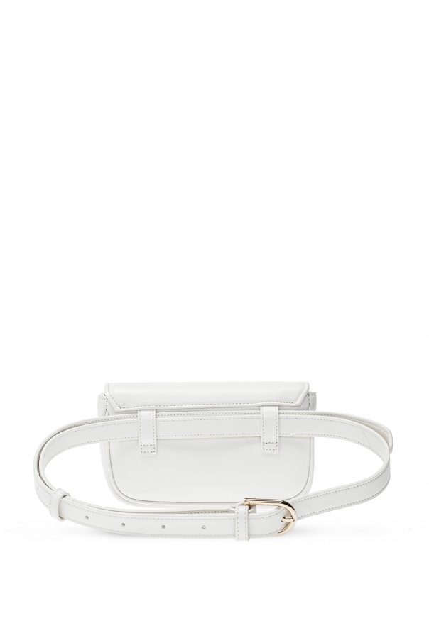 White ‘Cosy’ belt bag from Furla. Crafted from leather, this design features a decorative logo closure in gold-tone, beige suede lining and one internal compartment with a slip pocket and three card slots. This item can also be worn as a shoulder bag.