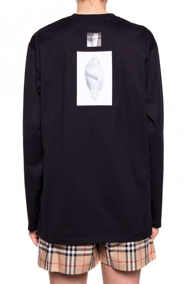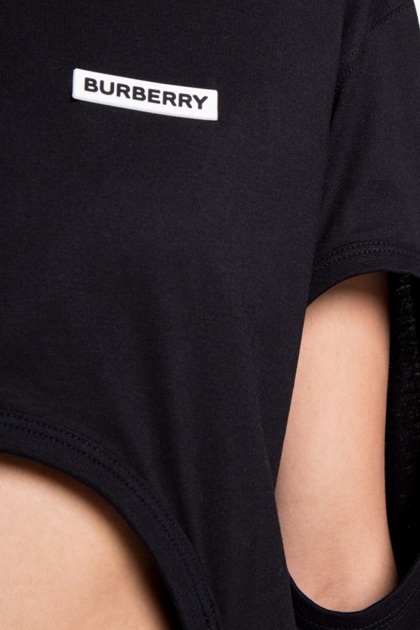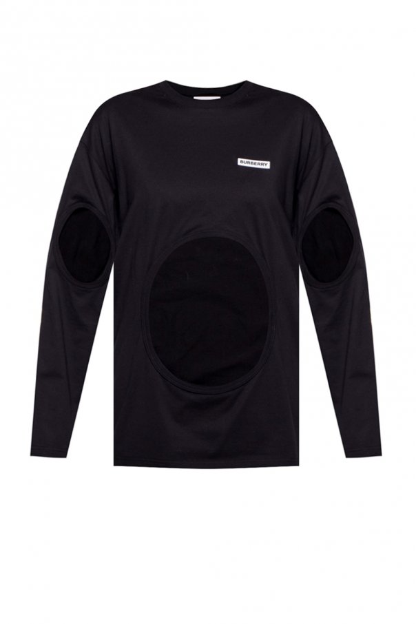 Black T-shirt with long sleeves from Burberry. Made of cotton. Decorated with a white and black logo patch and a white and grey print. Decorative cut-out details on the front and at the sleeves. Round neck.