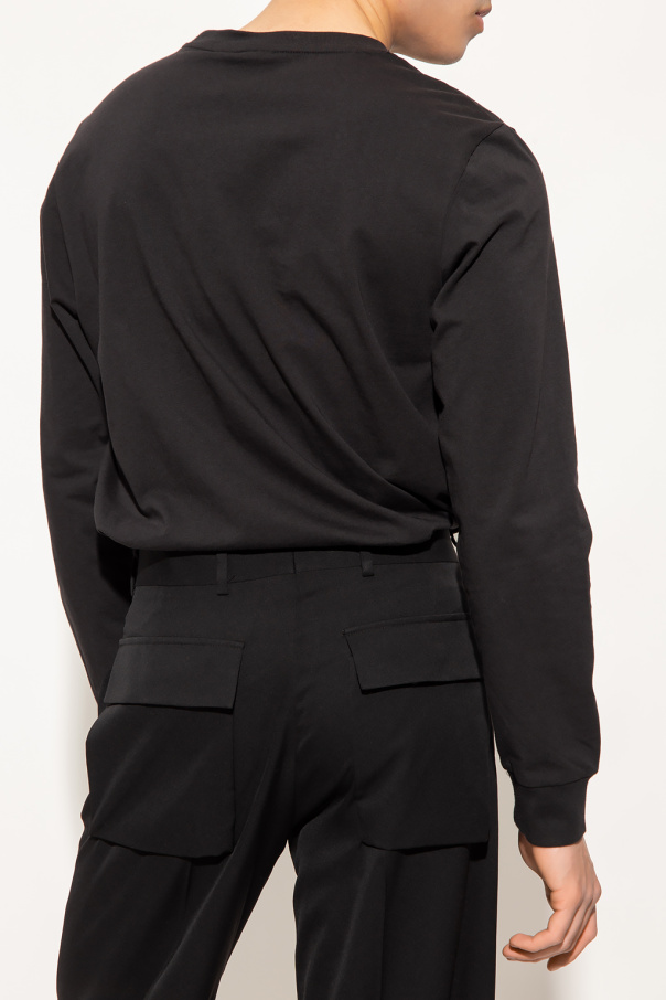 Black crewneck T-shirt from ADIDAS Originals, the ‘End Plastic Waste’ line. Made of cotton from sustainable sources as part of the Better Cotton Initiative, this style features long sleeves, an elasticated collar and cuffs and a white and black graphic print accompanied by a logo appliqué on the front.