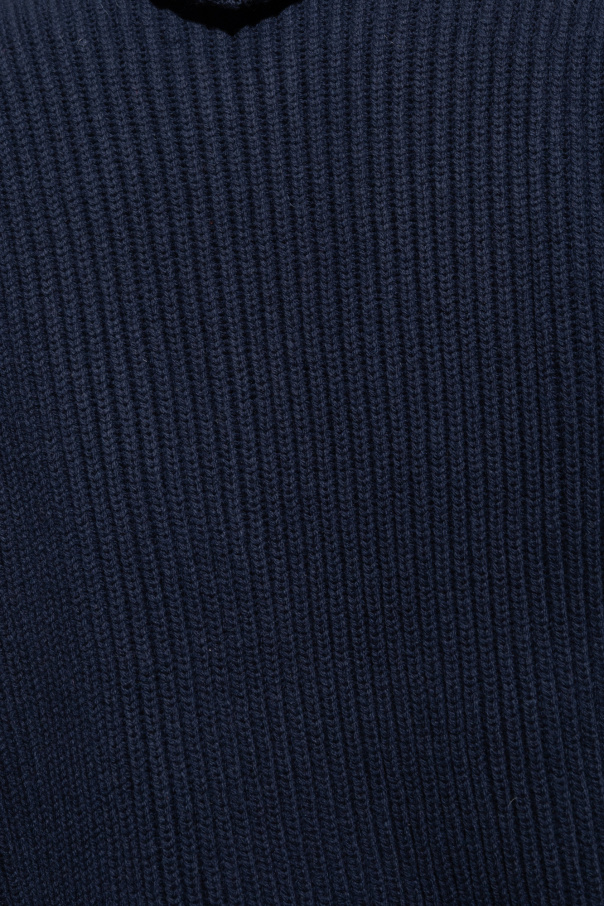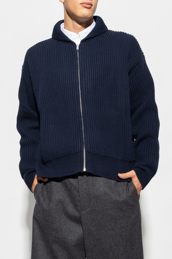 Navy blue cardigan with a collar from Jil Sander. Made of wool, this item fastens via a zip and features long sleeves with ribbed cuffs.