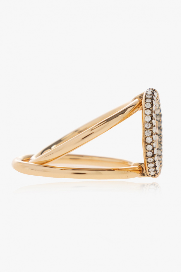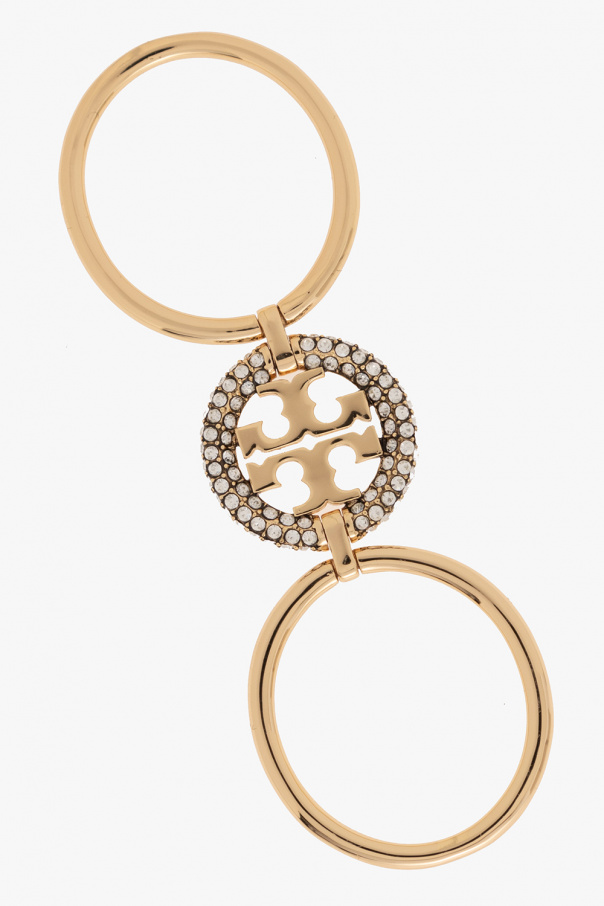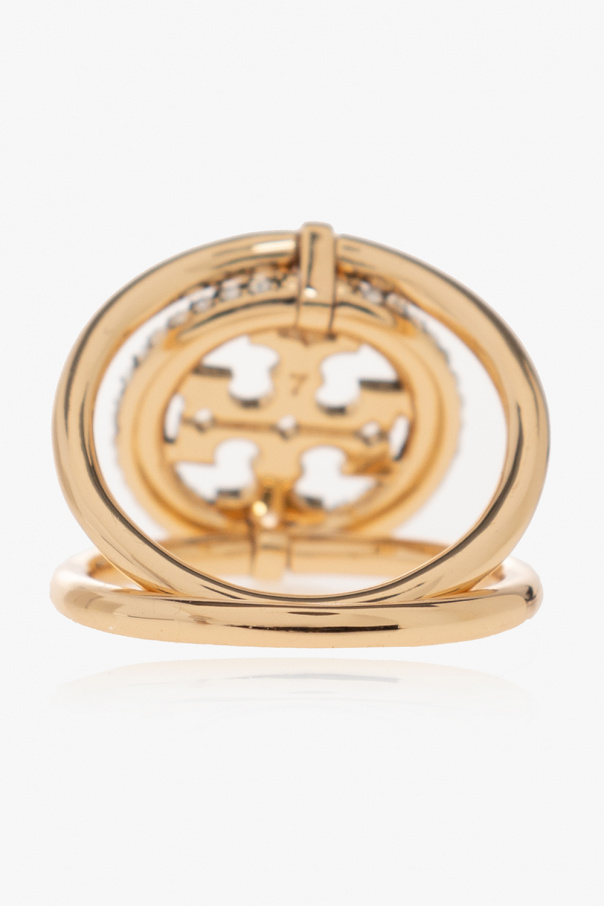 Gold-tone ‘Miller’ double ring from Tory Burch. Made of brass, this item showcases a logo appliqué encrusted with glossy crystals.