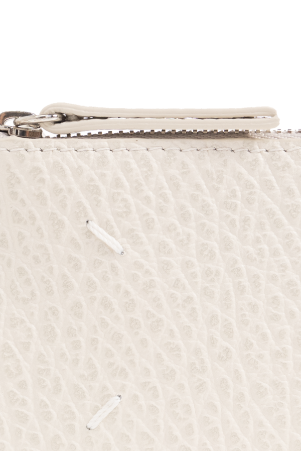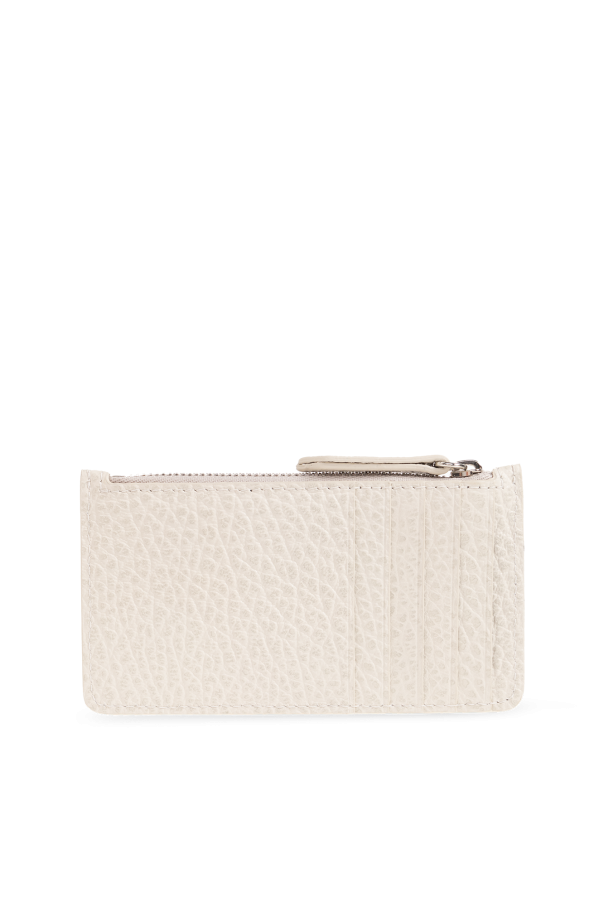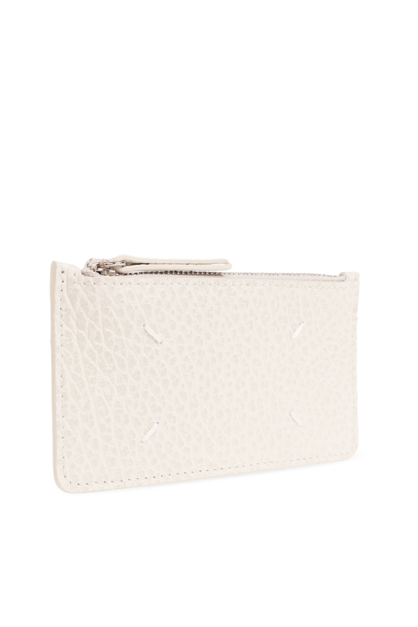 Cream and light grey card holder from Maison Margiela. Made of leather, this item features the brand’s signature stitches in white, zipped coin pocket, five card slots and silver-tone metal hardware.