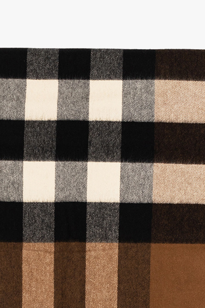 Brown scarf from Burberry. Made of cashmere, this item showcases the brand's signature check pattern in black, white and maroon and fringe ends.