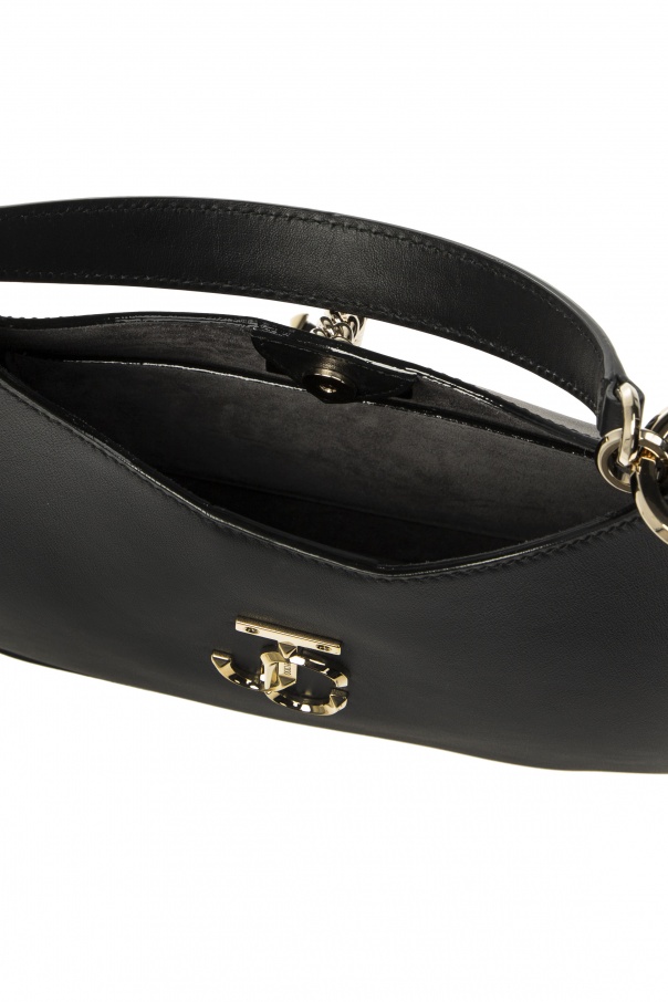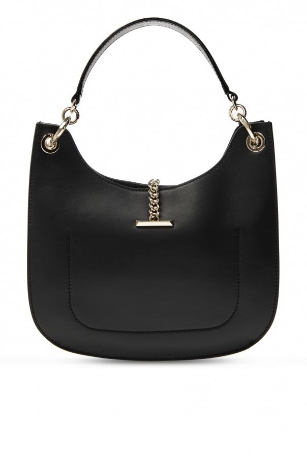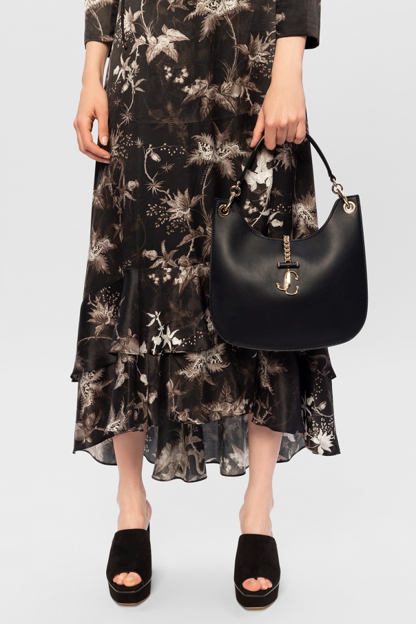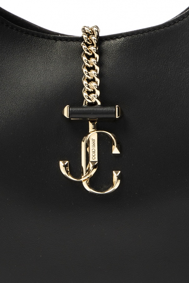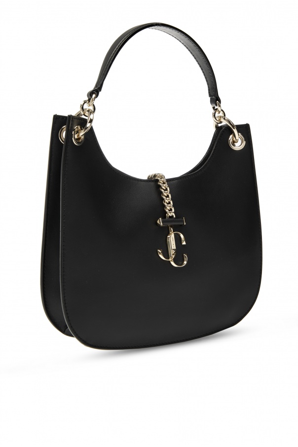 Black 'Varenne' hand bag from Jimmy Choo. Size medium. Crafted from calf leather, this carry-all item has magnetic snap fastening, silver-tone logo plaque, a half-round handle and grey clad interior with one compartment and one slip pocket.