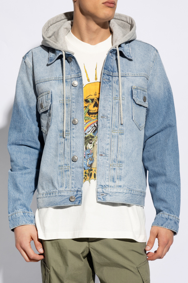 Introducing the `Spirit` Denim Jacket by AllSaints, a harmonious blend of timeless design and contemporary casual flair. This piece is meticulously crafted from 100% cotton, promising both comfort and durability. The dominant blue hue of the denim, paired with a contrasting grey hood, encapsulates a versatile aesthetic that transitions effortlessly from day to evening wear. The jacket features a classic round neckline and is adorned with metal buttons along the front and on the cuff sleeves, infusing a touch of traditional denim attire elegance. The front is thoughtfully designed with two flap pockets at the chest and two side pockets, offering practicality without compromising style. Highlighting its uniqueness, the left chest pocket is intricately stitched, hinting at a space reserved for a logo or brand label, though it remains unmarked for a sleek look. The grey hood, crafted from a distinct material that appears to be knit or cotton, is ingeniously attached to the jacket, ensuring it appears as an integral part of the ensemble. This casual addition enhances the jacket's versatility and appeal. Detailed with bold, contrasting stitching that is characteristic of denim apparel, and adjustable straps at the back for a tailored fit, the `Spirit` jacket is a testament to detailed craftsmanship and style. Why Should You Buy This Product? Made from 100% cotton for unmatched comfort and durability. Features a detachable hood, offering versatility in style. Equipped with four functional pockets, ensuring practicality meets fashion. Adjustable back straps allow for a customizable fit. Unbranded design for a clean and sophisticated look.