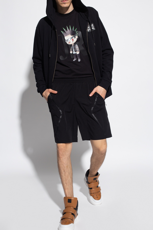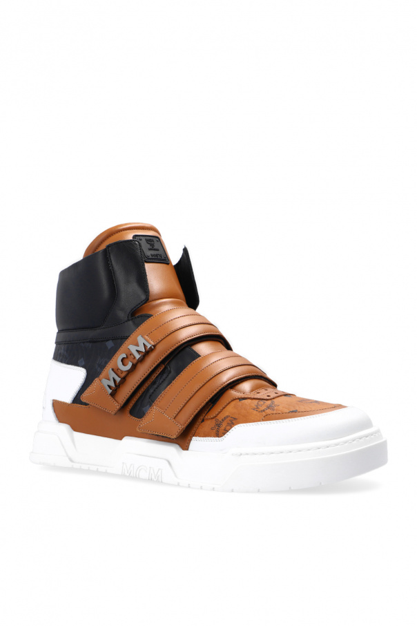 Brown, white and black high-top sneakers from MCM. Fastened with velcro, this pair is decorated with a metal logo detail in silver-tone, black logo print and white rubber sole.