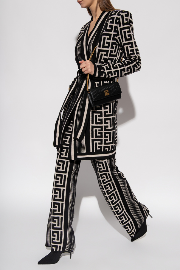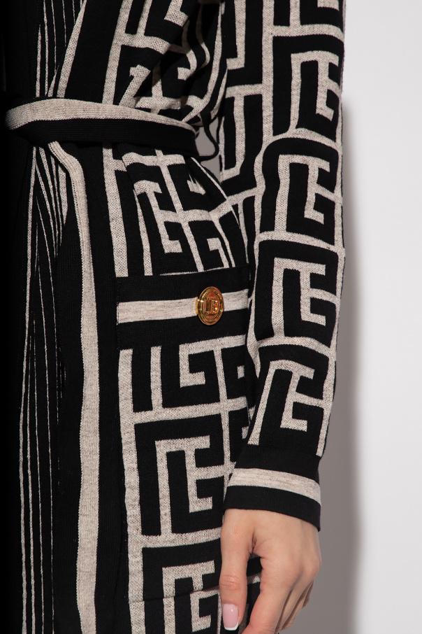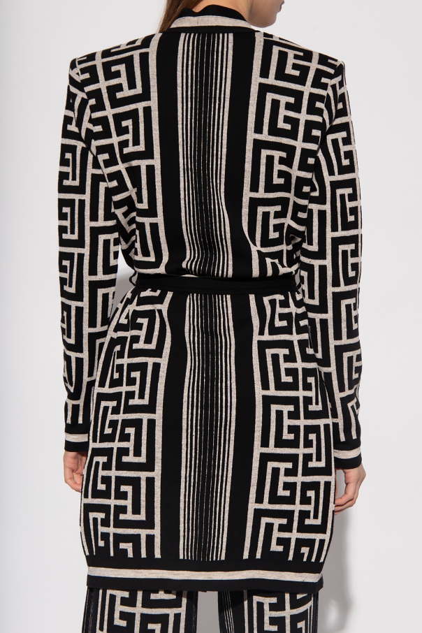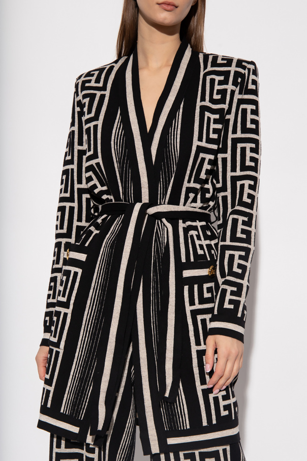 White and black cardigan from Balmain. Crafted from a wool and linen blend, this style showcases a monogram pattern, padded shoulders, a waist-cinching belt and two pockets fastened with a decorative button.