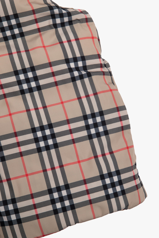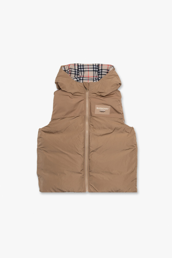 Reversible, beige, hooded, down vest from Burberry Kids. Fastened with a zip, this design is padded with down and has two snap-fastened pockets. One side is decorated with the brand’s signature multicolored check pattern. The other side is plain with a logo patch.