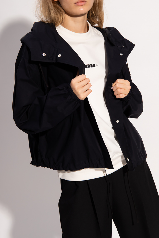 Navy coat from Jil Sander. Made of cotton, this design features snap fastenings, a drawstring hood and hem, two snap-fastened pockets and long sleeves with ribbed trims.