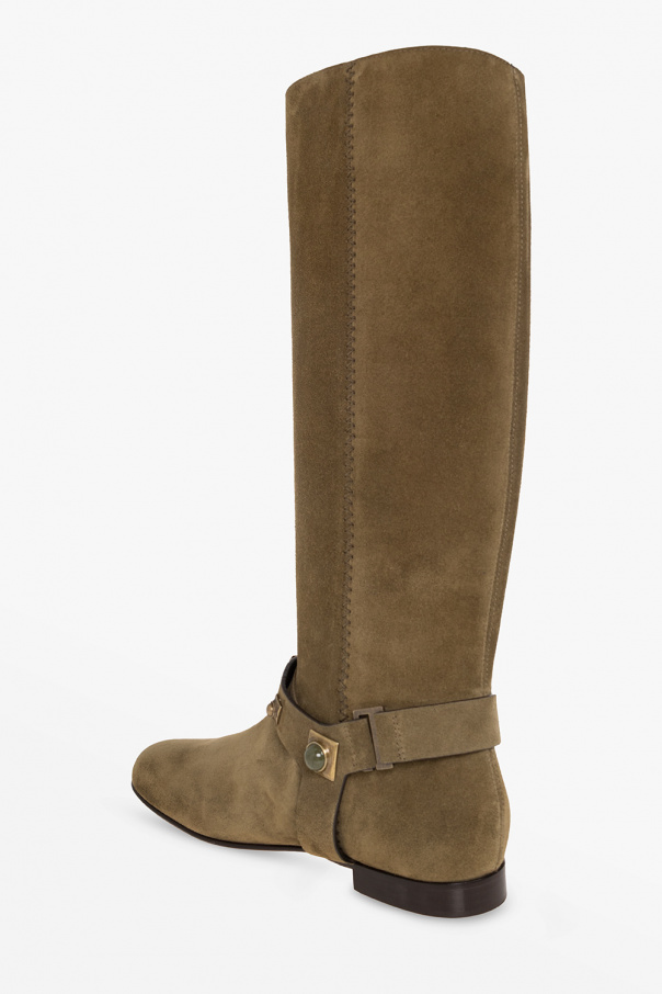 Green knee-high boots from Etro. Made of suede, this slip-on pair features a decorative straps with metal appliqués embellished with cabochons and beige leather sole with rubber trims.