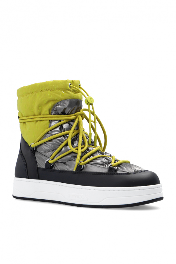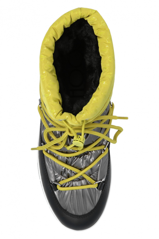 Green, silver-tone and black ‘Wanaka’ snow boots from Jimmy Choo. Embellished with a monogram motif, this lace-up model features leather trims and a black and white rubber sole.