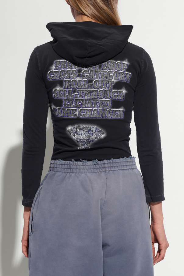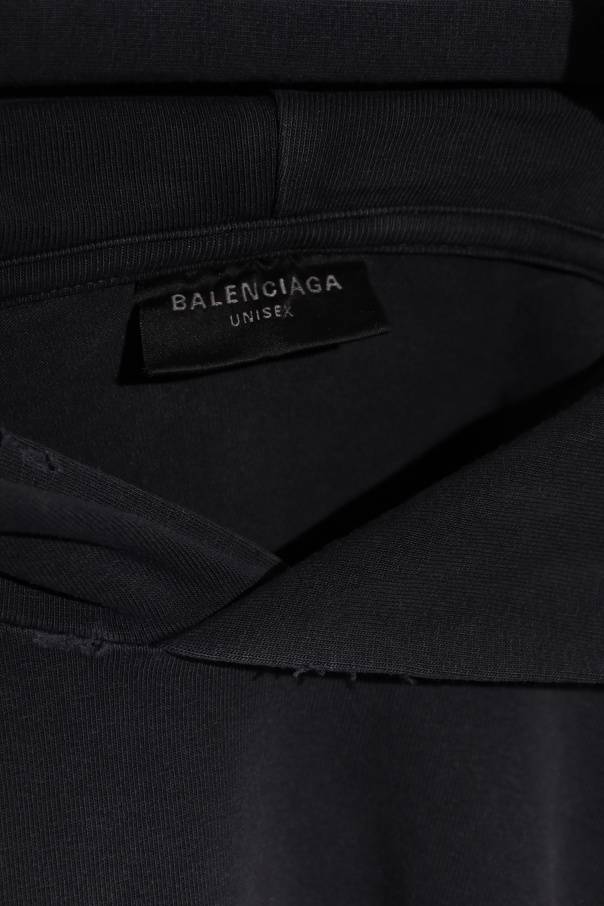 Introducing an epitome of avant-garde elegance: the Black Hooded Top from the exclusive Balenciaga Unisex Collection. This meticulously designed piece is a harmonious blend of luxury and contemporary edge, tailored for those who lead the fashion forefront. The dominant noir palette is accentuated with a striking, silver inscription of "SEE NOW BUY NOW" along with the iconic www.balenciaga.com on its front, signaling not just a piece of clothing, but a statement. Crafted from a sumptuous blend of 94% cotton and 6% elastane, this top offers an unparalleled comfort with a hint of stretch, ensuring a perfect silhouette. The material's smooth texture complements the vintage effect, bringing an air of understated sophistication. Distinctive features include the repeated "SEE NOW BUY NOW" motif on one of the sleeves and the back, alongside a unique diamond-shaped arrangement of varied-sized words, encapsulating the essence of this collection's uniqueness. The designer logo, "BALENCIAGA UNISEX", subtly placed, confirms the authenticity and universal appeal of this exquisite piece. Why Purchase This Product? Elegance Meets Comfort: A luxurious blend of high-quality materials ensures both style and comfort. Exclusive Design: Unique inscriptions and arrangements set this top apart, making it a collector’s item. Vintage Charm: The vintage effect adds a layer of sophistication and depth to the design. Unisex Appeal: Designed for everyone, this top stretches the boundaries of traditional fashion norms.