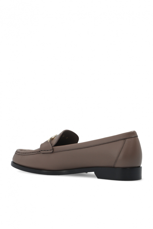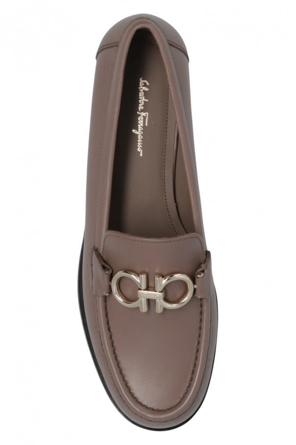 Greyish brown ‘Rolo’ moccasins from Salvatore Ferragamo. Made of calf leather, this model features distinctive stitching details, the brand's signature Gancini hardware on the front and a black leather sole at the base.
