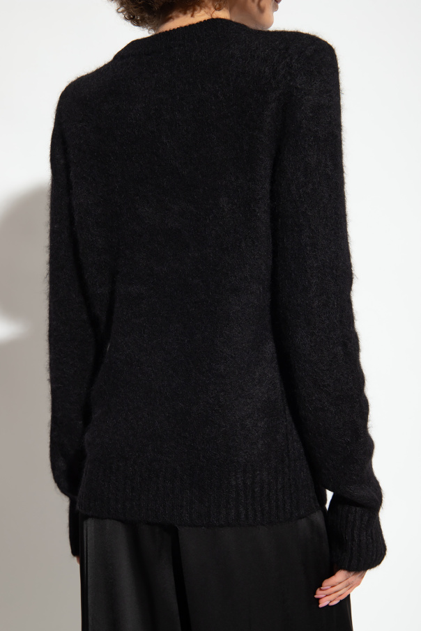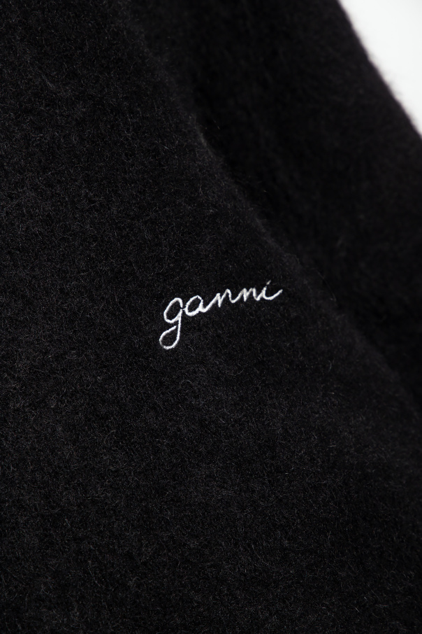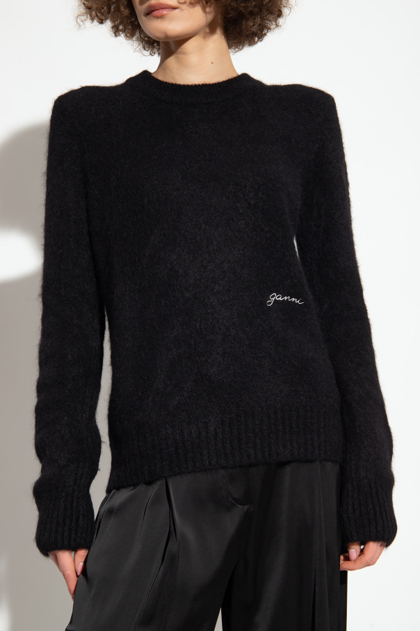 Black furry sweater from Ganni. Decorated with a white logo embroidery on the front, this design has ribbed trims at the crew neck, hem and cuffs.