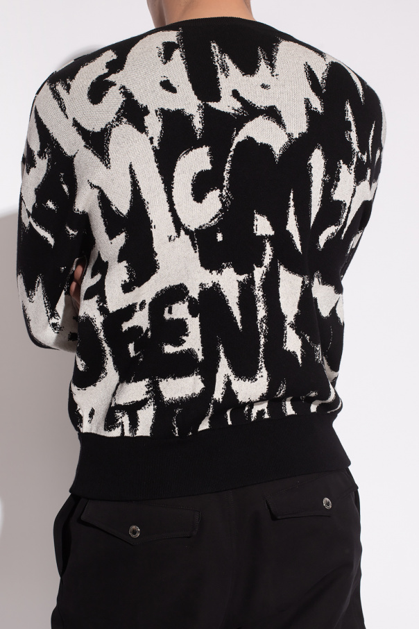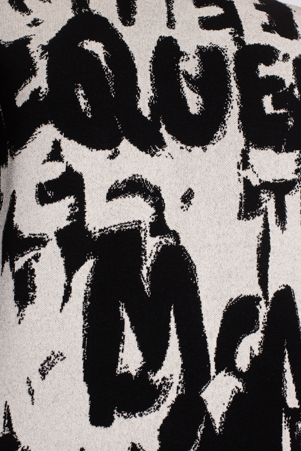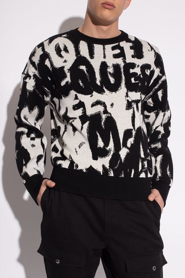 Black and cream crewneck sweater from Alexander McQueen. Crafted from a wool blend, this style showcases the brand's ‘McQueen Graffiti‘ motif and ribbed trims on the bottom hem and cuffs.