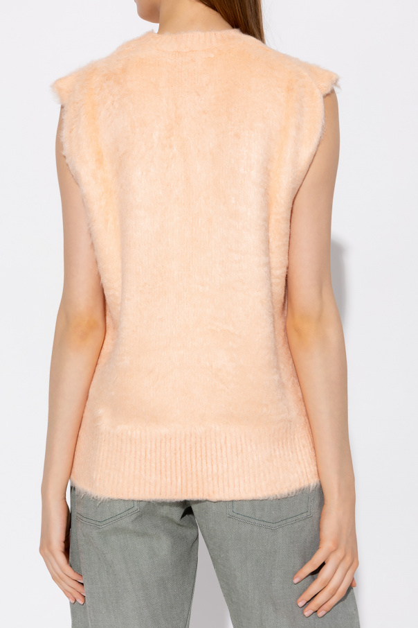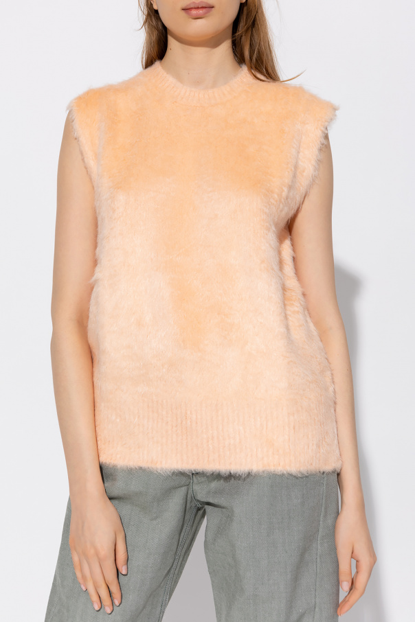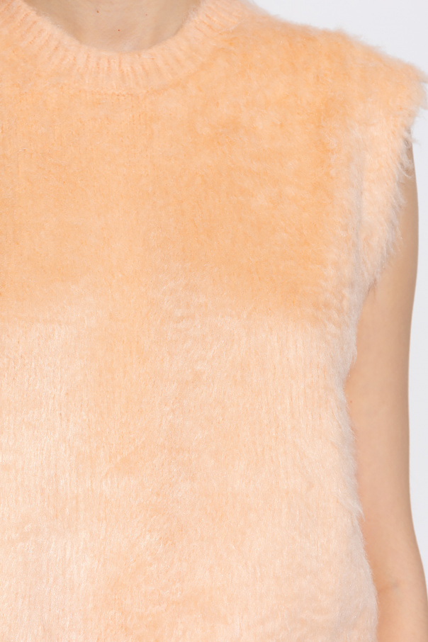 Light orange sleeveless sweater from Jil Sander. Made of silk, this design features ribbed trims at the round neck and hem.