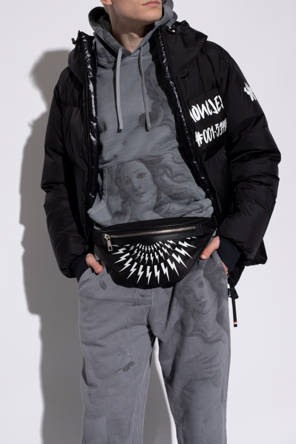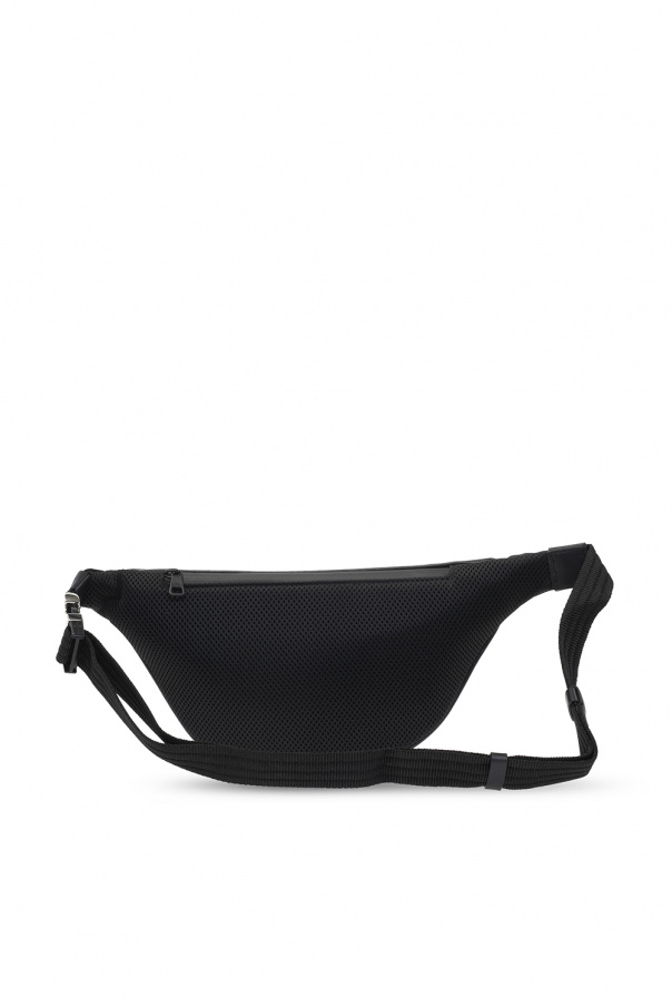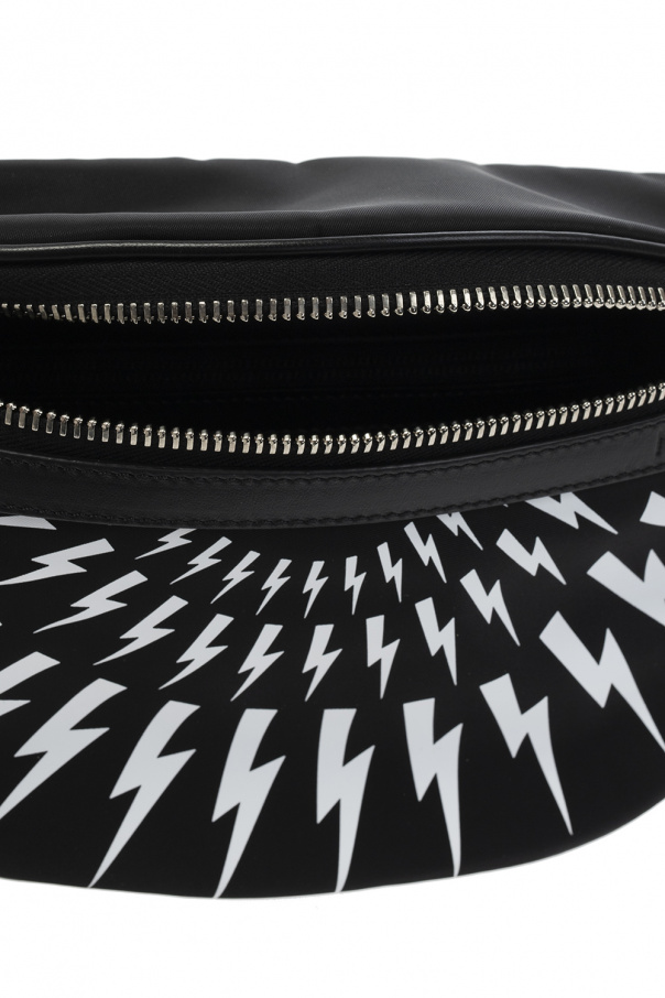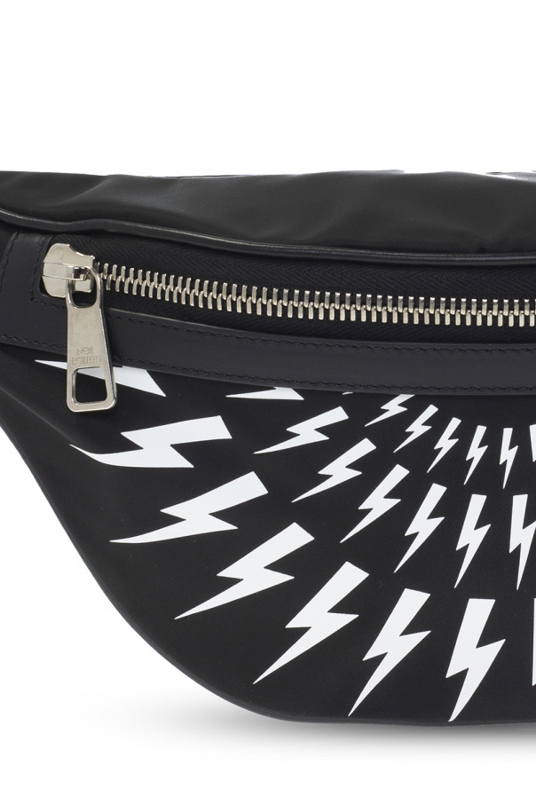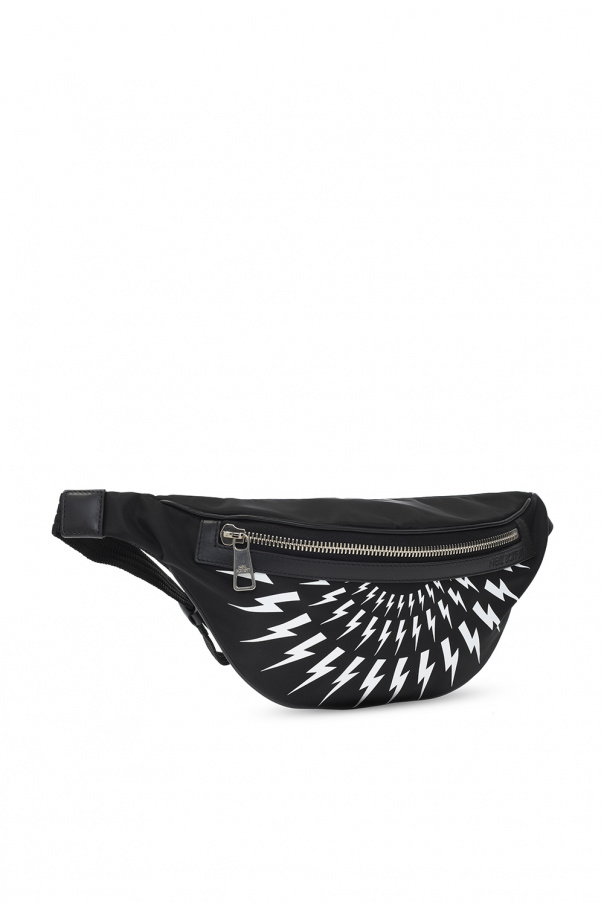 Black belt bag from Neil Barrett. Printed with the designer's logo in white, this design fastens via a zipper and showcases leather trims, an external zip pocket on the front, a mesh back, an adjustable strap with a buckle, silver-tone metal hardware and one internal compartment.