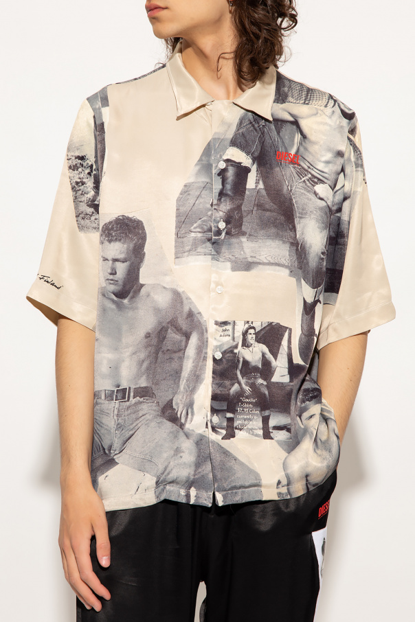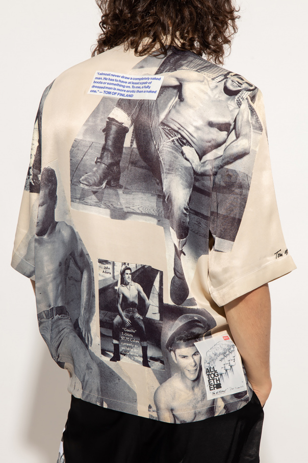 Beige ‘PR-S-MEC-P2’ shirt from Diesel, the ‘AllTogether Pride’ capsule collection. Fastened with buttons, this garment features grey graphics from the catalogue of the Tom of Finland Foundation, white, grey and black patch, patch with a quote, red logo print and short sleeves. Created in participation with Tom of Finland Foundation (ToFF).