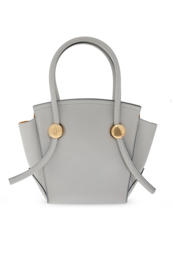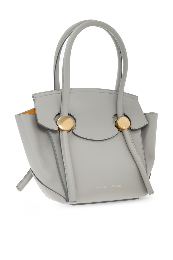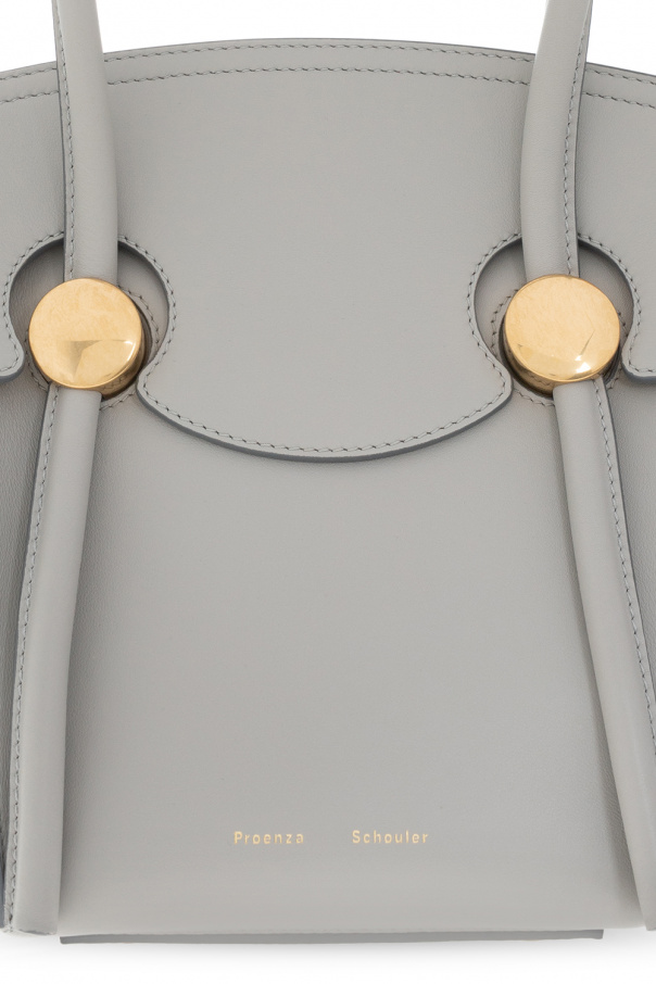 Grey shoulder bag from Proenza Schouler. Made of calf leather, this design secures with a magnetic flap and features two half-round handles, gold-tone metal hardware and one internal compartment with one zip pocket and one slip pocket.