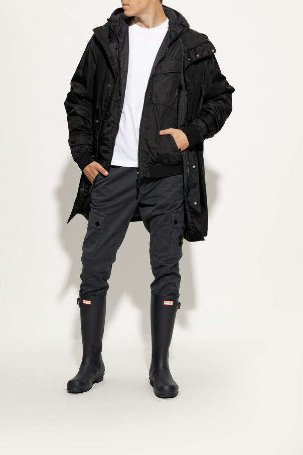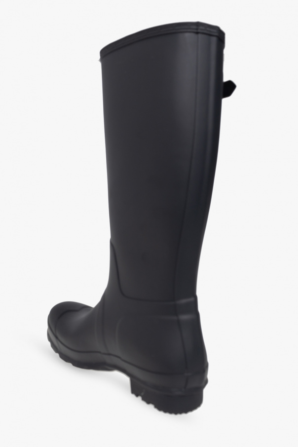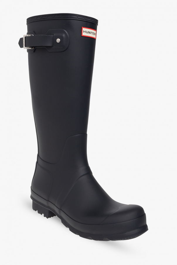 Navy blue ‘Original Tall’ rain boots from Hunter. Crafted from 28 hand-cut parts of natural vulcanised rubber with a matte finish, this model sits on a rubber sole accentuated with a signature tread pattern and features a logo appliqué on the front and a buckle strap on the side.