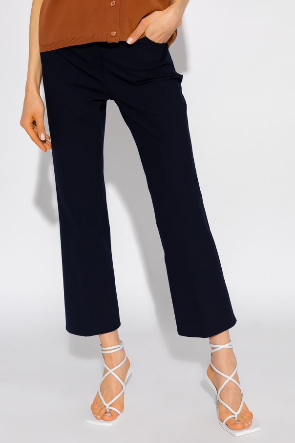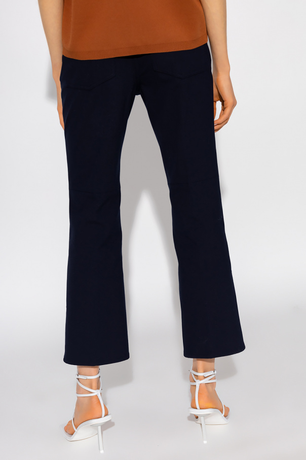 Navy blue trousers from Theory. Falling with flared legs, this pair features a zip fly with a button and a hook, three pockets on the front and two at the back.