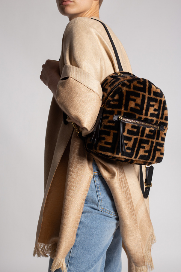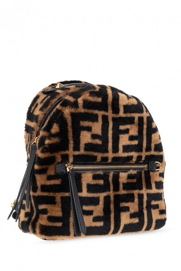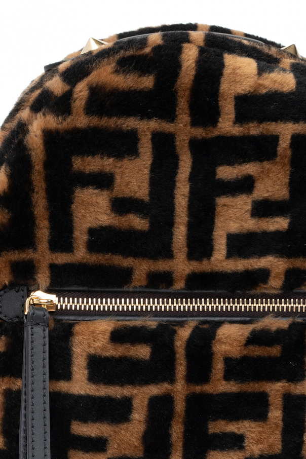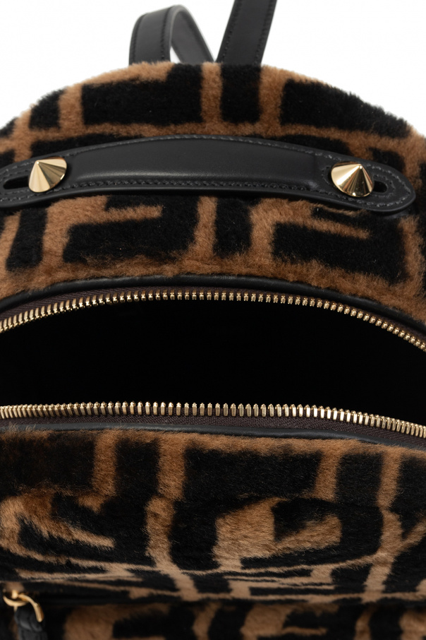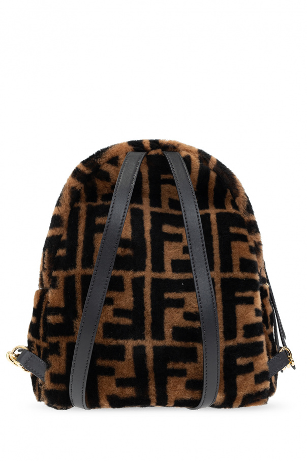 Brown and black backpack from Fendi. Crafted from sheep wool and distinguished by the FF monogram, this design features a zip fastening, a half-round top handle, adjustable shoulder straps, gold-tone metal hardware and one internal compartment with a zip pocket.