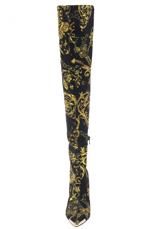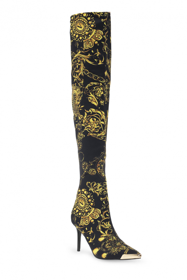 Black heeled knee-high boots from Versace Jeans Couture. Enriched by the brand's iconic graphic motif in gold-tone, this model showcases a pointed toe silhouette, a zip closure and a black rubber sole.