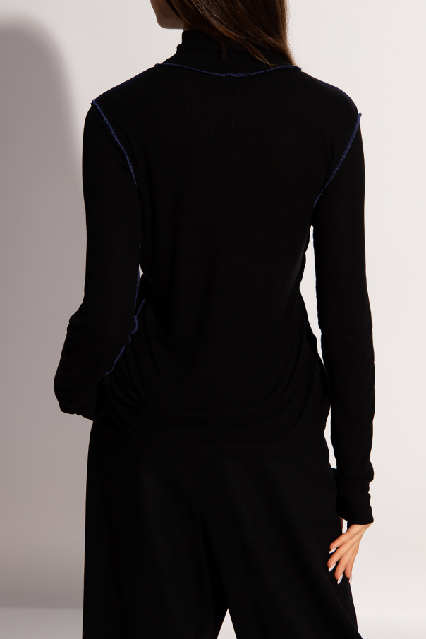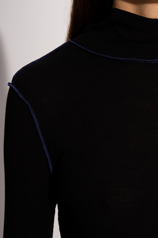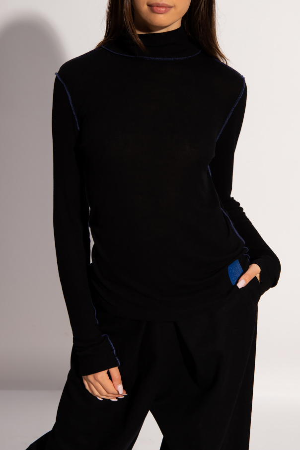 Black ribbed top with a band collar from Loewe. Made of a silk blend, this long sleeve design features a logo-embossed patch and decorative dark blue stitching details.