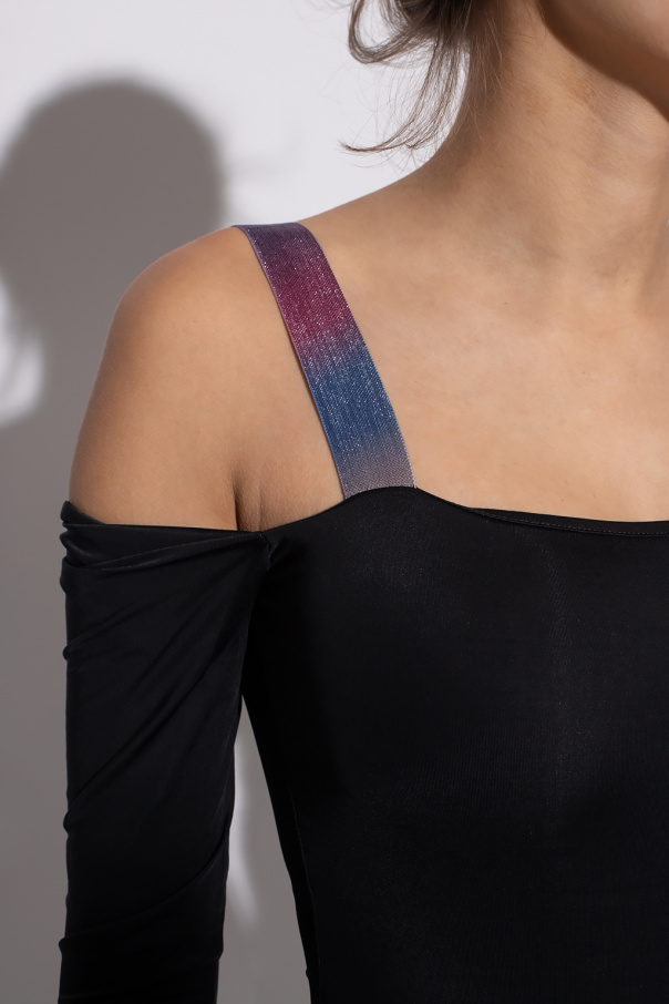 Black body from Diesel. Fastened with snaps, this long sleeve design features a multicolored glossy straps with a black logo embroidery.