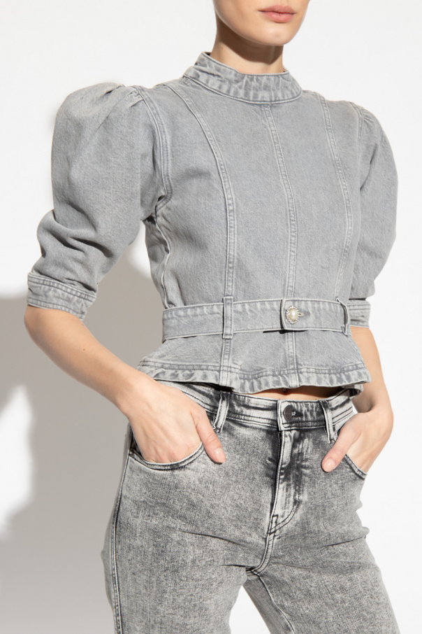 Grey ‘Natalia’ denim top from Custommade. Crafted in part from organic cotton, this style secures with a back zipper and features an attached waist-cinching belt with a decorative glass pearl button and glossy appliqués, and short puff sleeves with button cuffs.