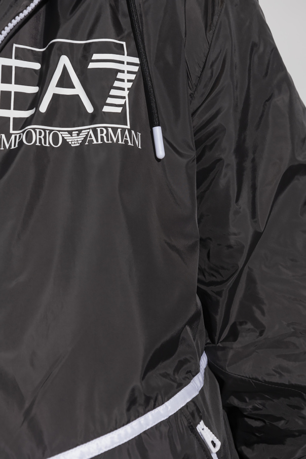 Black and white jacket from EA7 Emporio Armani, the ‘Sustainable’ collection. Fastened with a two-way zip, this design features drawstrings at the hood and hem, white logo print, two front zip pockets, long sleeves and cotton lining.