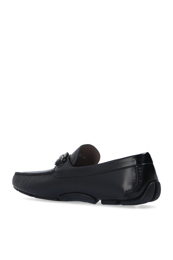 Black ‘Parigi’ moccasins from Salvatore Ferragamo. Crafted from calf leather, this model features the label’s iconic horsebit in grey and a black rubber sole.