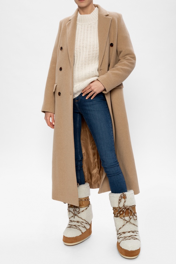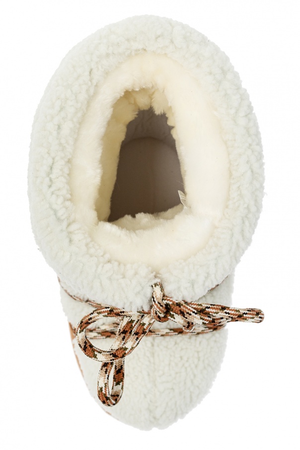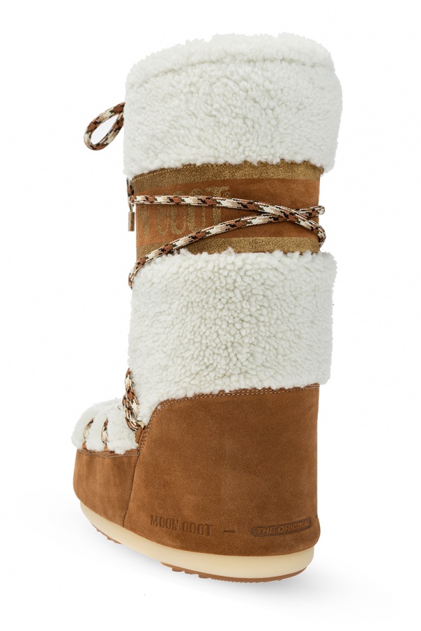 Brown and cream ‘Shearling’ snow boots from Moon Boot. Crafted from shearling, this model features decorative tie fastening, gold-tone logo print and a rubber sole in beige and brown. Inspired by the peculiar shape and technology of the astronauts' boots, the iconic style was designed in 1969 after the first Moon landing.