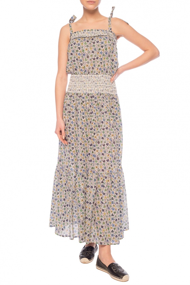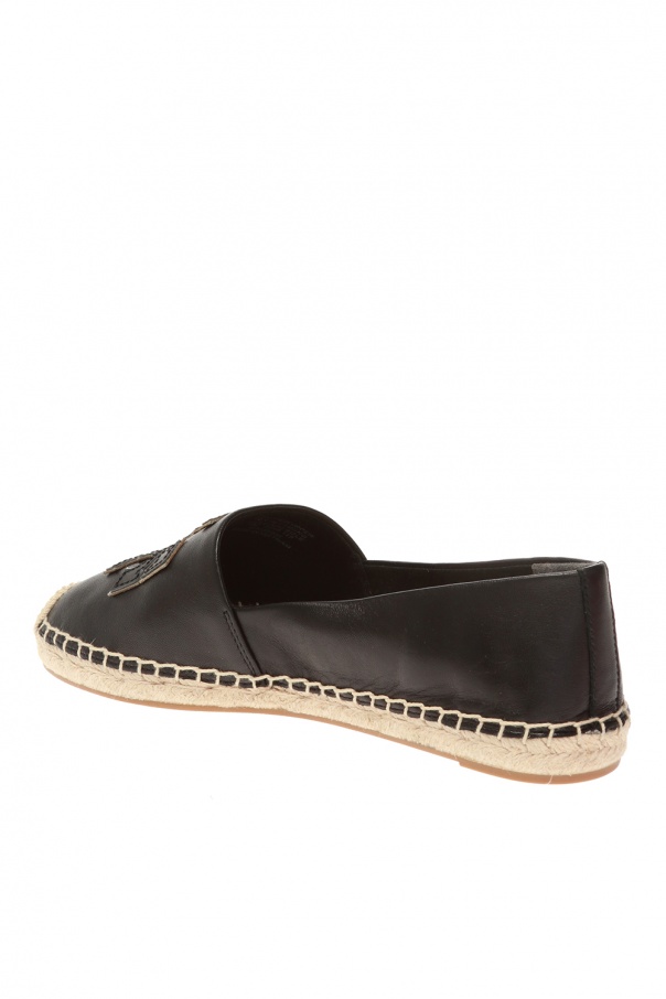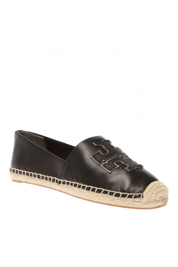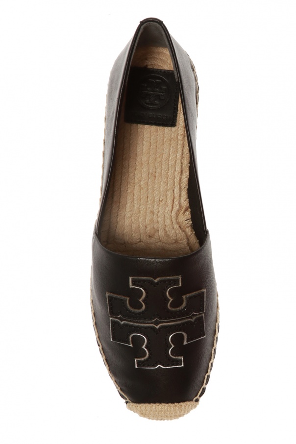 Black espadrilles from Tory Burch. Made of leather. Finished with beige textile inserts. Embellished with embroidered black and silver-tone logo on the front. Seated on a brown rubber sole.