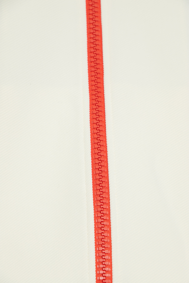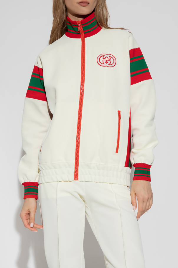 Cream sweatshirt from Gucci. Made of textured fabric, this design features a zip fastening, Interlocking G logo patch, two zip pockets and ribbed trims at the stand collar and cuffs with stripes in green and red.