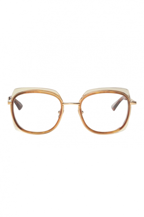 Optical glasses from Emmanuelle Khanh. Gold-tone frame. Brown tips embossed with gold-tone logo. Attached black protective clutch fastened via decorative snap-button.