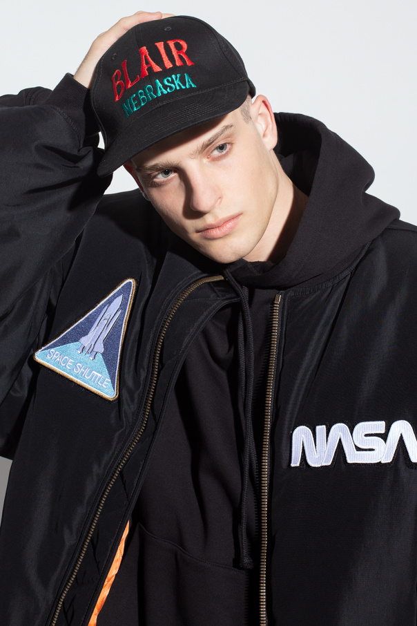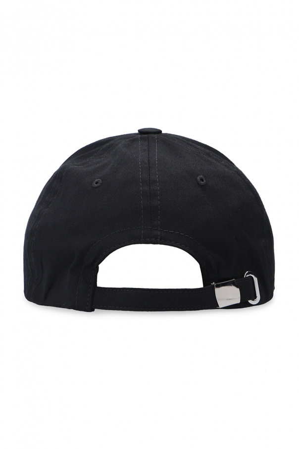 Black baseball cap from Raf Simons. Crafted from cotton, this garment features an embroidered red and bluish green pattern as well as an adjustable buckle strap at the back.