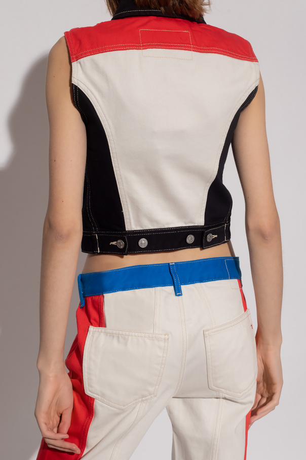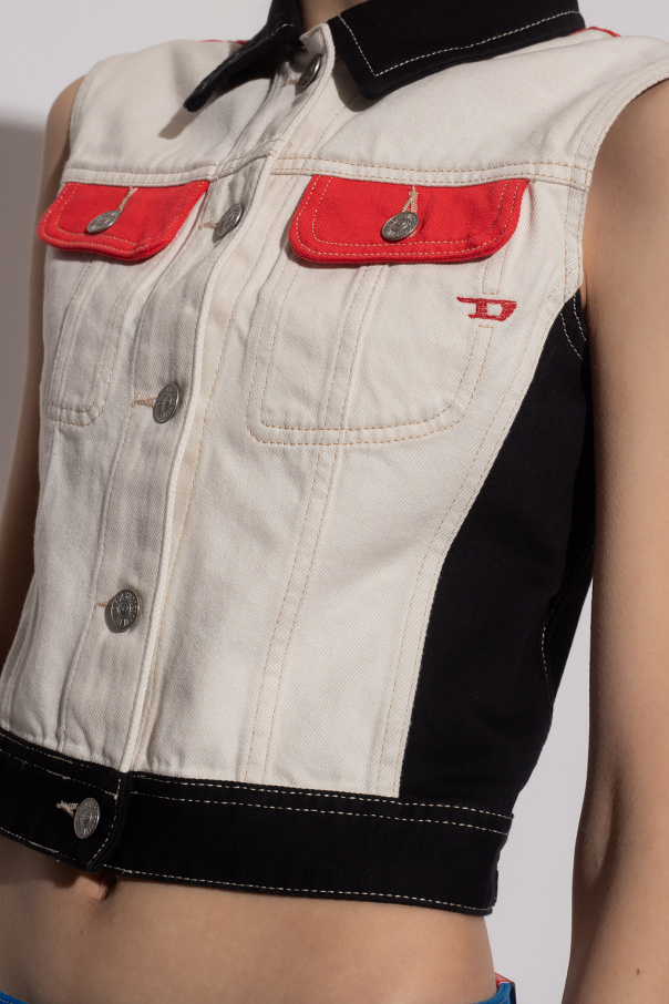 Beige, black and red ‘D-Slimmy’ denim vest from Diesel. With a cropped, fitted silhouette, this style features front button fastenings, an embroidered emblem and two flapped button pockets.