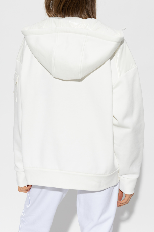White hoodie from Moncler. Crafted from cotton and shiny fabric, this garment features a two-way zip, snap-fastened flap pocket with a felt logo patch on the shoulder, drawstring hood, two slip pockets, black straps with a logo on the sides and ribbed trims at the hem and cuffs.