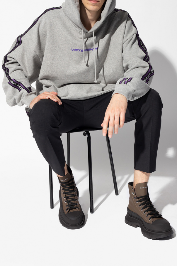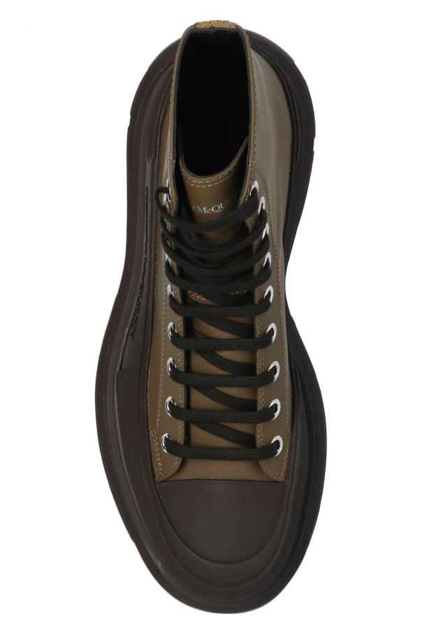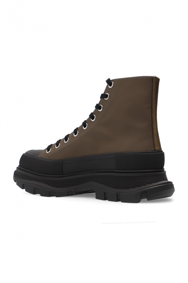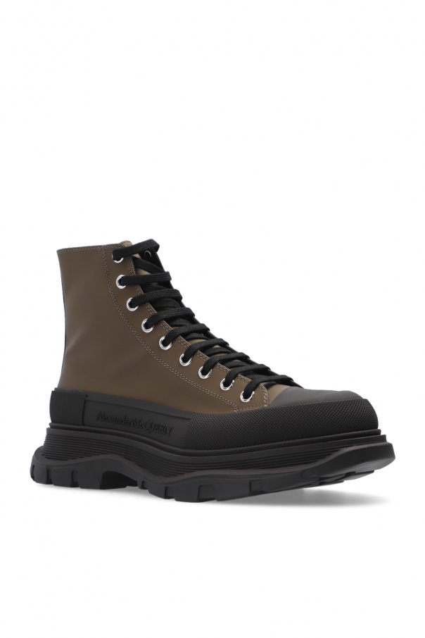 Khaki boots from Alexander McQueen. Crafted from leather, this lace-up pair is decorated with an insert embroidered with a logo pattern and rests on a black rubber sole.