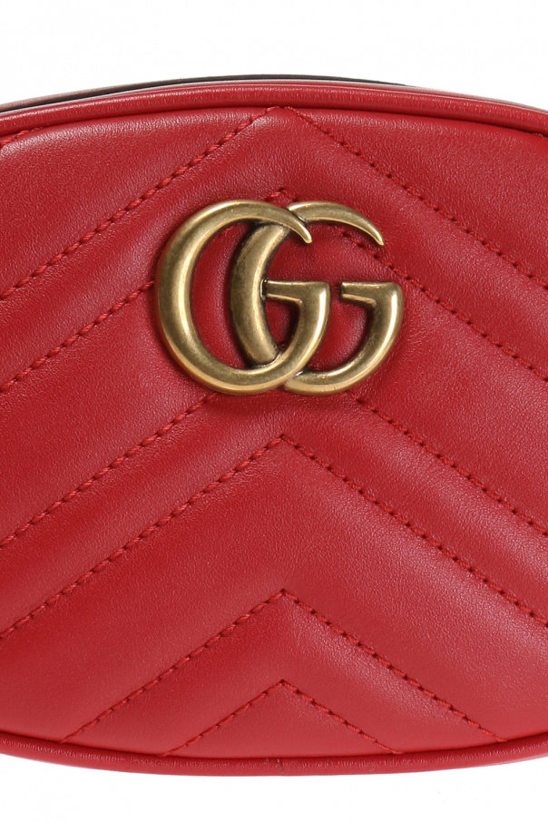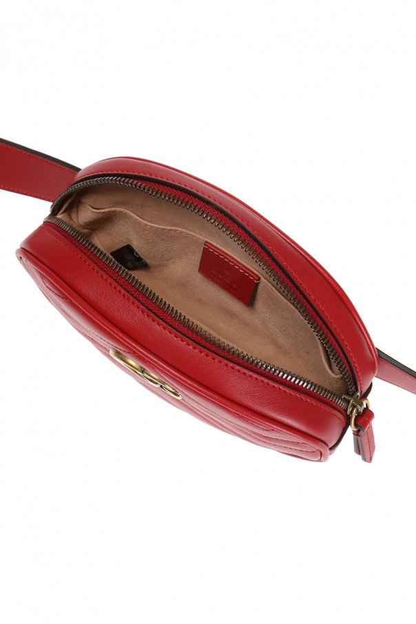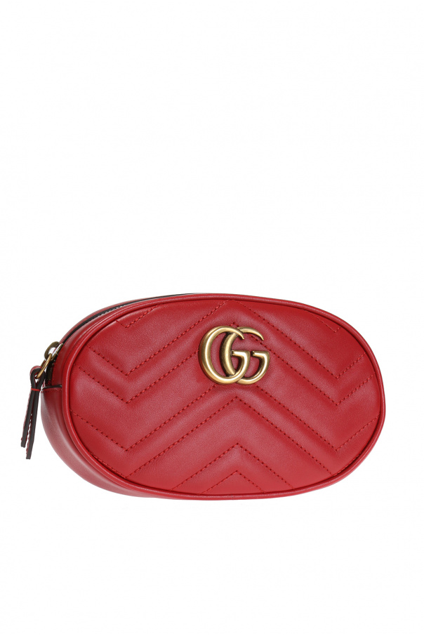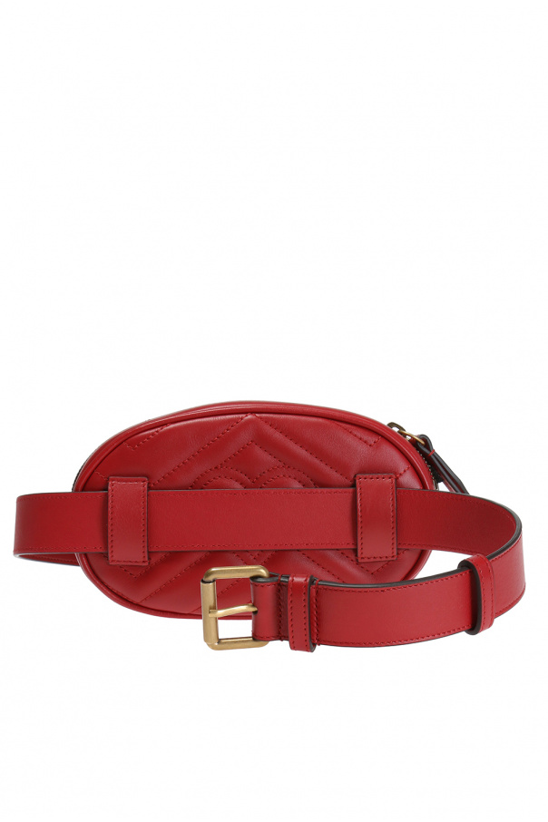 Red 'GG Marmont' quilted belt bag from Gucci. Made of smooth leather. Fastened with zip. Detachable and adjustable waist belt. Beige suede interior with a slip pocket. Antiqued gold-tone metal hardware.