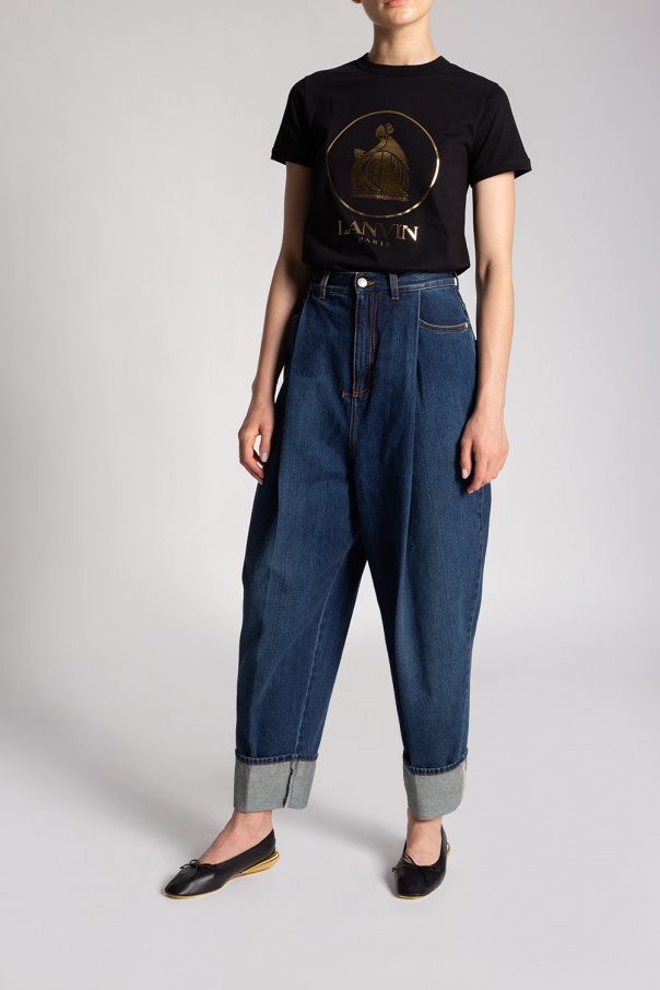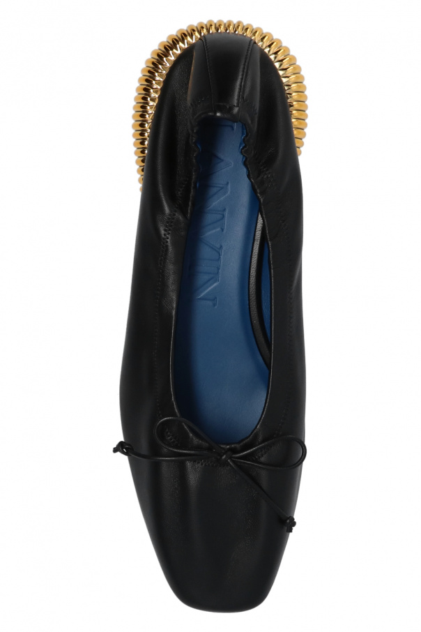 Black ballet flats from Lanvin. Made of leather, this pair features a bow, elasticated back, gold-tone metal appliqué and light brown leather sole.
