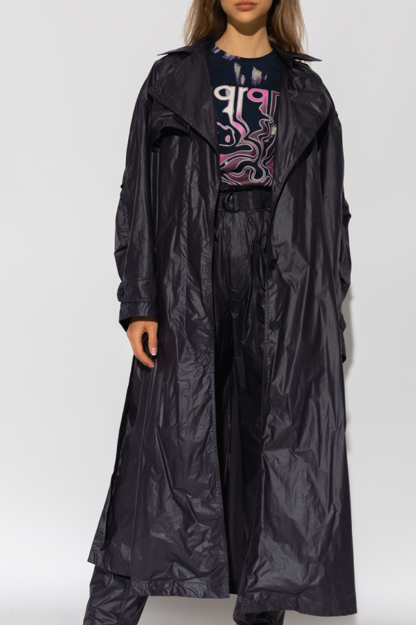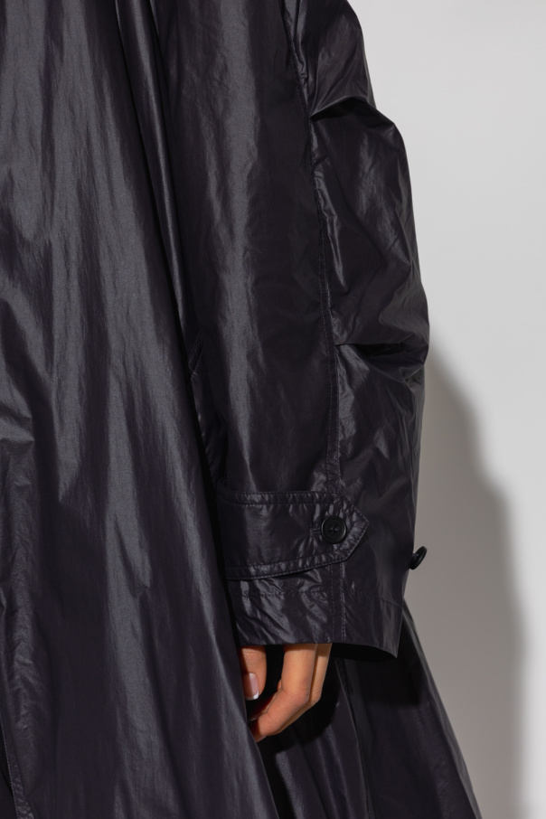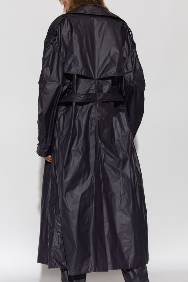 Black ‘Edge’ coat from Isabel Marant. Fastened with buttons and an adjustable waist belt, this design features a collar with snap and hook fastenings, storm flap, buttoned epaulettes, two slip pockets, single rear vent and long sleeves with buttoned cuffs.