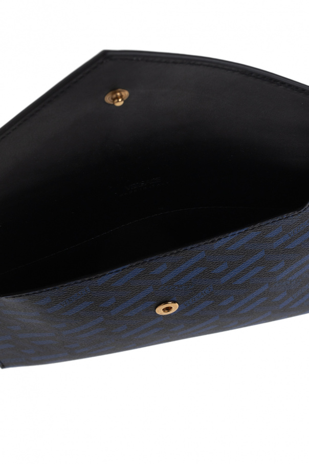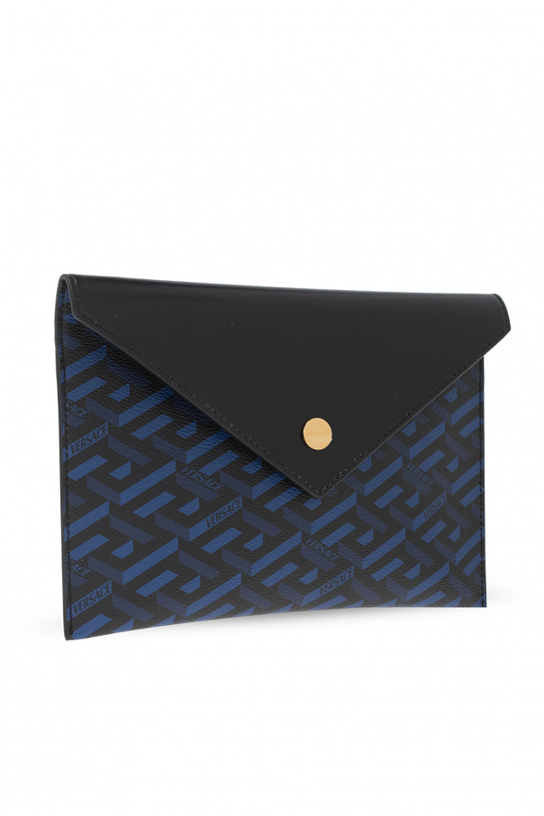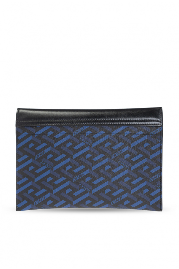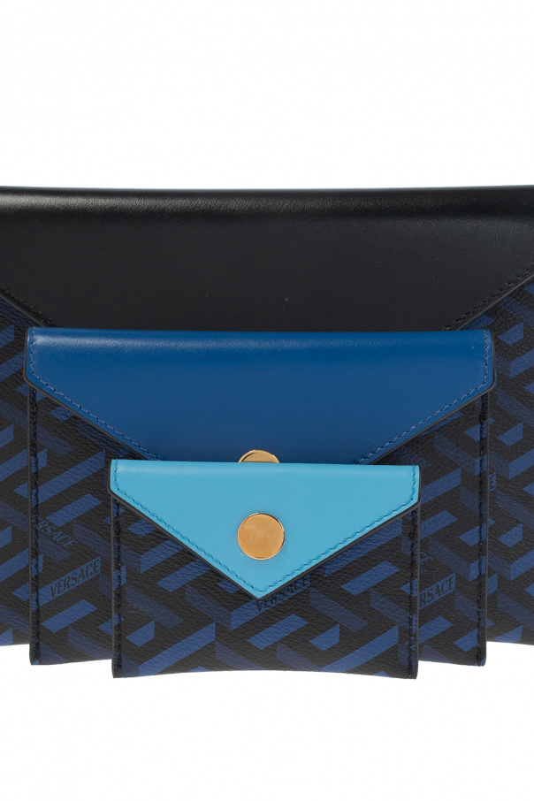Set of three pouches in black, navy blue and blue from Versace. Arriving in different sizes, they feature snap fastenings and the brand's signature ‘La Greca’ pattern.